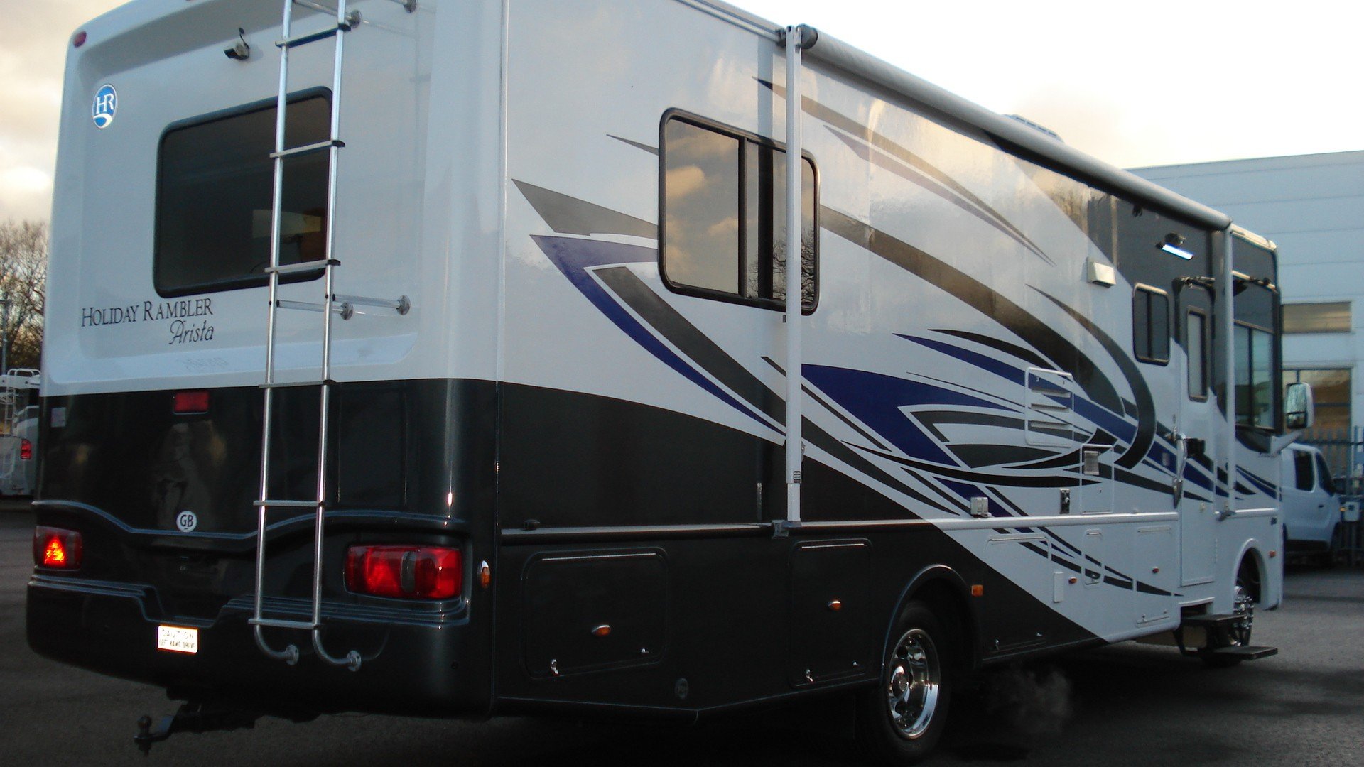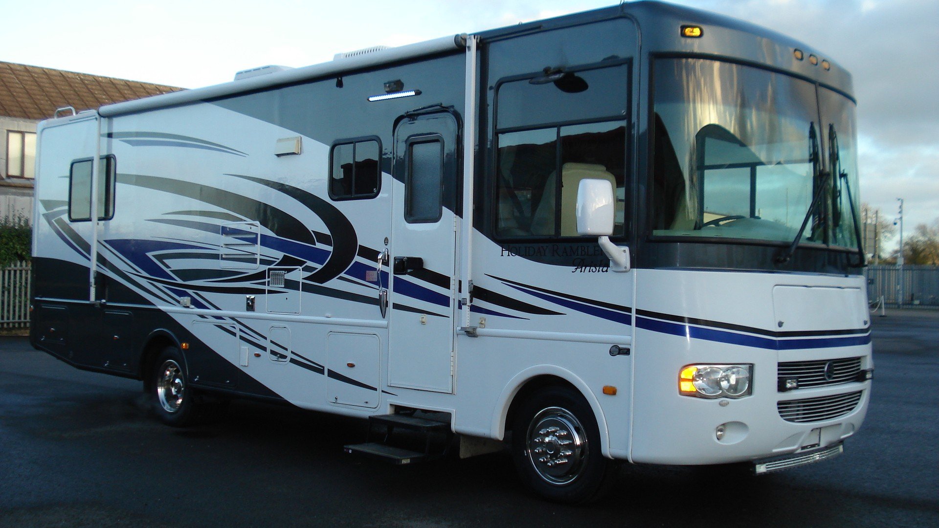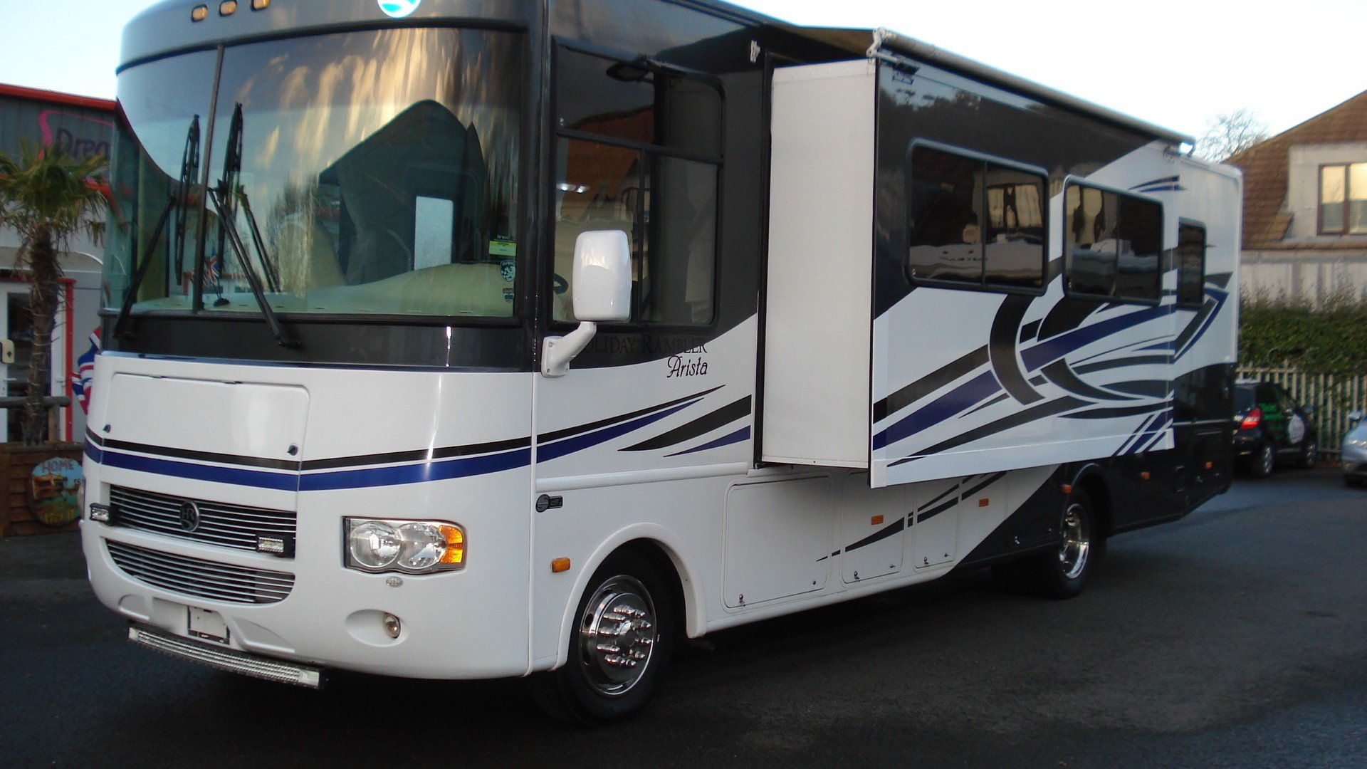 Holiday Rambler Arista. 310 model. Workhorse chassis. 30ft with Super slide. Chevy 8.1 vortec V8. Alison 5sp. Auto with tow haul. Long range LPG Conversion. Basement Lockers with Through lockers. Rear Queen Island bed in end bedroom. Ample wardrobe and storage space. Fitted T.V. and invertor Shower room with W.C. and vanity wash basin. Laminated type flooring through to kitchen area with all fitted appliances. Gas and electric water heater. Dinette/bed with fitted seatbelts. All re upholstered in cream Leather. Bed settee with fitted seat belts. Electric six way Cream Leather front captains 360 seats with 3 point belts. Front T.V. Oyster self seeking satellite system 240/110/12v electrics. 12v 240v invertor. On board 5kva Onan generator. Large solar panel. Hydraulic levelling jacks. Reversing camera and sensors. UK spec tow hitch and electrics. Insurance approved alarm/immobiliser. Plus all the standard American RV refinements . A well maintained example of one of these quality H.R. RVs. with all manuals/and documented history.